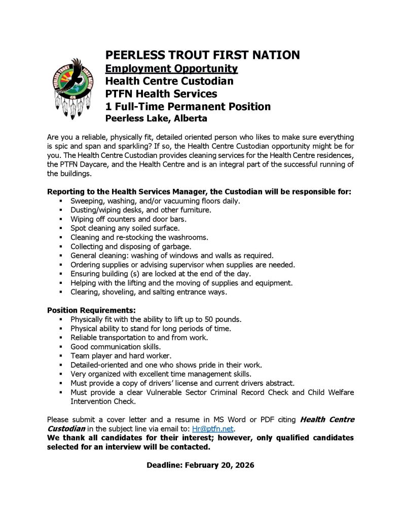 Employment Opportunity Health Centre Custodian PTFN Health Services1 Full-Time Permanent Position Peerless Lake
